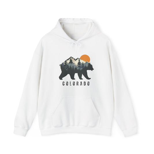 Denver Mile High Hoodie with printed sleeves, Denver sunset with mountains and Mile High on printed sleeves