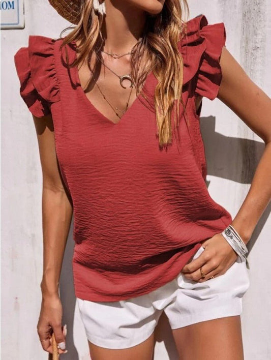 Ruffles Folds Solid Shirt V-Neck Short Sleeve Loose Pullover